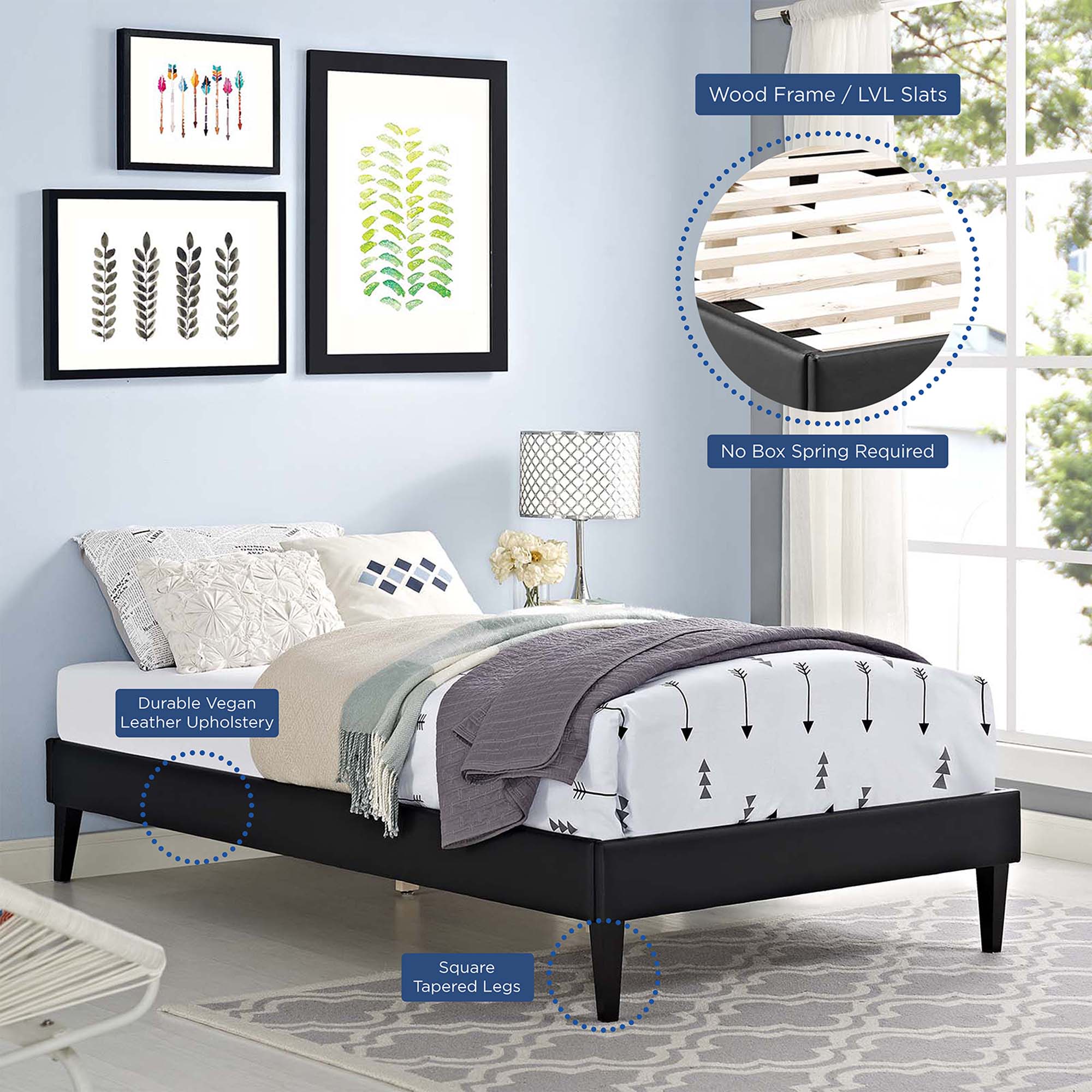 Accelerate your bedroom decor with the Tessie Platform Bed. Made with a solid wood frame upholstered in vinyl, Tessie features tapered wood legs, plastic foot glides, ten sturdy wood slats with a centered supporting bar and two support legs for enhanced stability. Due to the wooden slat support system, the use of a box spring is unnecessary. Tessie supports memory foam mattresses such as our Aveline series, and is compatible with one of our headboard styles: Jessamine, Terisa, Laura, Phoebe, Camille, and Josie. Perfect for mid-century modern, minimalist and contemporary bedrooms. Mattress not included.