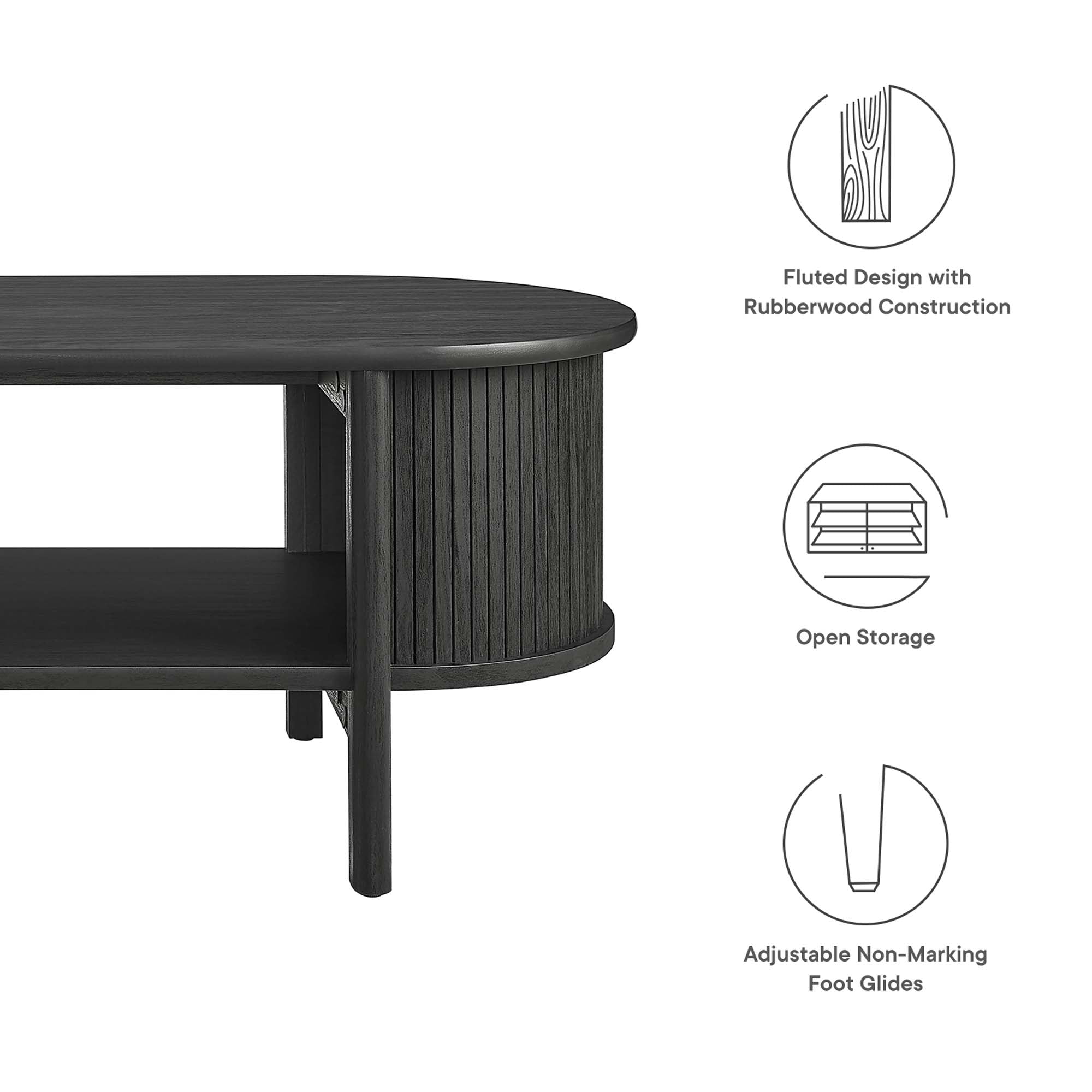 Revolutionize your home or apartment decor with the Cadence Coffee Table. This mid-century modern piece is perfect as a central table in your living room, offering both style and functionality. The unique design features curved edges and fluted details, adding a stylish flair to any space. Crafted from high-quality materials such as rubberwood, particleboard, and MDF, the Cadence coffee table is designed for longevity and showcases a beautiful wood grain laminate, enhancing the organic aesthetics of your living or lounge area. This oval coffee table is perfect for various uses, comfortably supporting books, decorative items, or beverages. It includes an open shelf underneath for displaying or organizing home decor, making it an excellent open storage coffee table as well as a modern accent table. Adjustable non-marking foot glides provide added stability. With an oval shape and chic silhouette, the Cadence fluted coffee table is a great living room essential that complements a variety of decors. Assembly required. Tabletop Weight Capacity: 169 lbs.