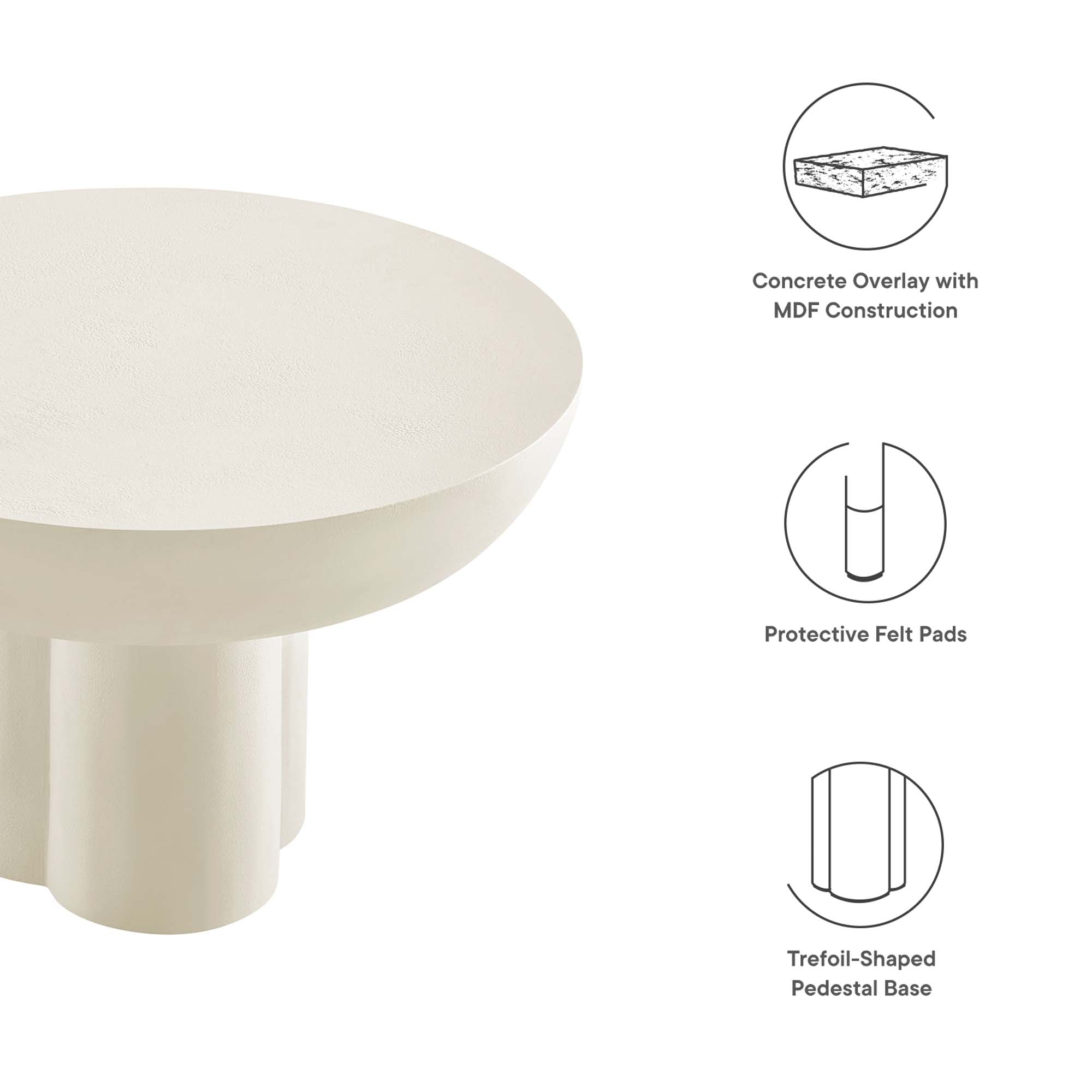 Transform your living space with the Caspian Coffee Table, a versatile and modern piece, the perfect center table for living room gatherings and daily relaxation. This striking round coffee table, an eye-catching feature in any living room or lounge area, showcases a unique trefoil-shaped pedestal base, effortlessly blending mid century modern aesthetics with contemporary design. Constructed from MDF with a stylish concrete overlay, this coffee table combines durability with a chic design. The Caspian living room table, complete with felt pads for floor protection, brings a modern vibe into your living room decor or urban apartment. Assembly required. Weight Limit: 275 lbs.