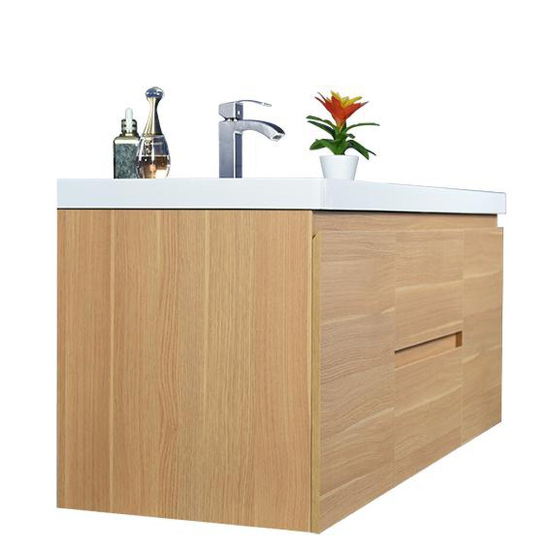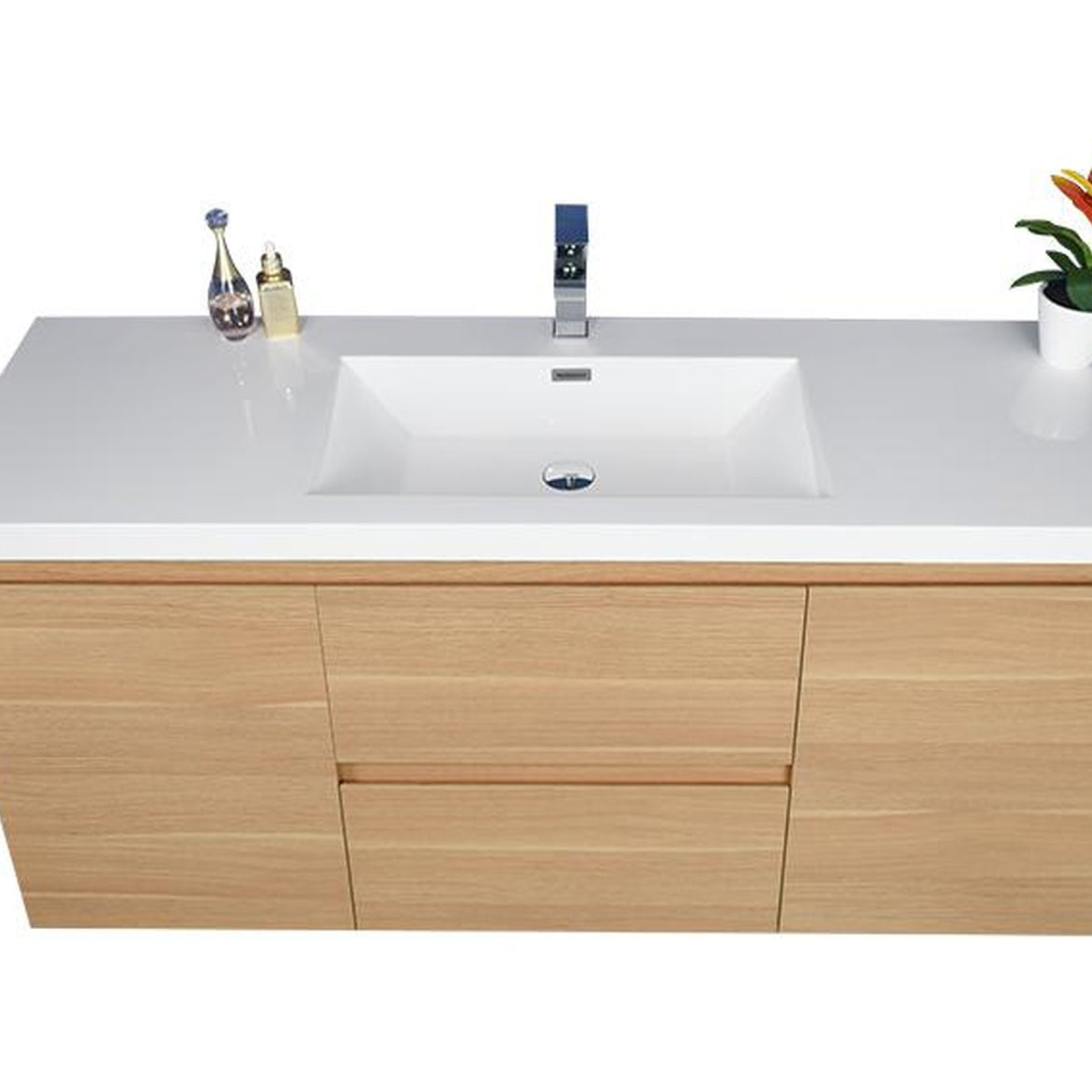 - Veneer medium-density fiberboard cabinet compliments the white acrylic top for a durable and seamless feel