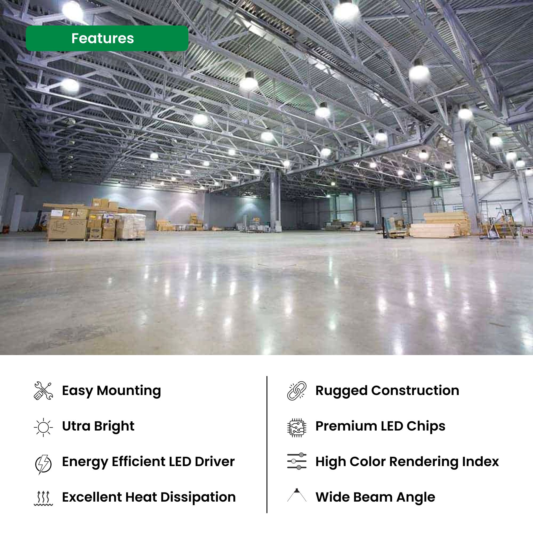 The 100W UFO LED High Bay Light delivers 16,799 lumens of bright, energy-efficient illumination, making it an excellent choice for warehouses, factories, workshops, garages, gyms, supermarkets, airports, and exhibition halls. With a 5000K daylight white color temperature, it ensures clear visibility and a well-lit environment for industrial and commercial spaces.