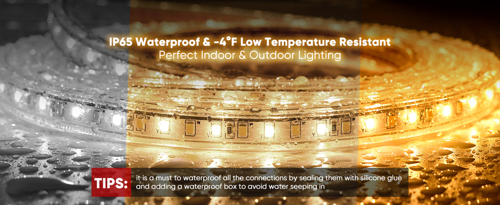 - The light body is IP65 splash-proof, but when used outdoors, make sure to keep the power cord, connections, and end tail side indoors or in waterproof boxes to avoid water seeping in! Not for places where there is prolonged contact with water (e.g. pools).