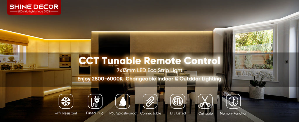 CCT LED Strip light Tunable White 3-Color-in-1, Dimmable 2800K/4500K/6000K warm white/ natural white/cool white Changeable 120V LED Strip Light with Remote 203Lumens/M, 16FT-131FT Connectable 120V led tape light ETL Listed IP65 Waterproof for Indoor Outdoor.